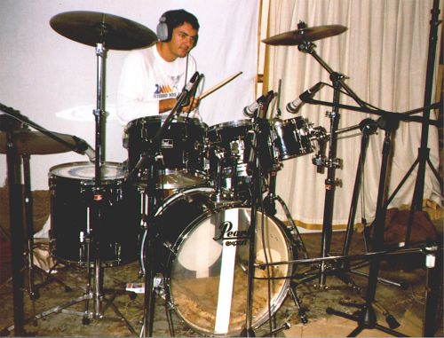 A very young me again in the studio playing and recording my beloved Pearl drums. This area of my studio was raised off the floor (like a small stage) creating a good bass trap and also providing some acoustic separation. The stage is still in my studio but is now used as my main photographic area with my drums now in storage...